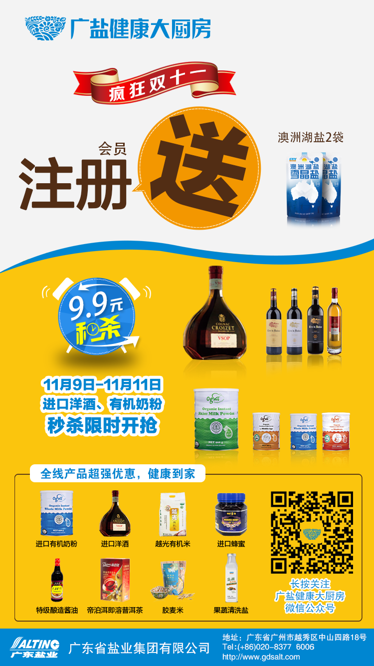 廣東省鹽業(yè)集團在11月組織開展全省統(tǒng)一的廣鹽健康大廚房“雙11” 營銷活動。活動期間,用戶關注“廣鹽健康大廚房”微信公眾號(微信號:gyjkdcf)并注冊為會員的,每人均可免費獲贈兩包澳洲湖鹽(250g),另外還有多款商品限時“9.9元秒殺”及全場打折優(yōu)惠活動,活動詳情及參與方式請大家關注廣鹽健康大廚房。